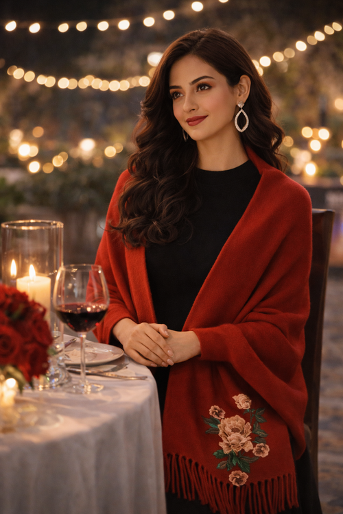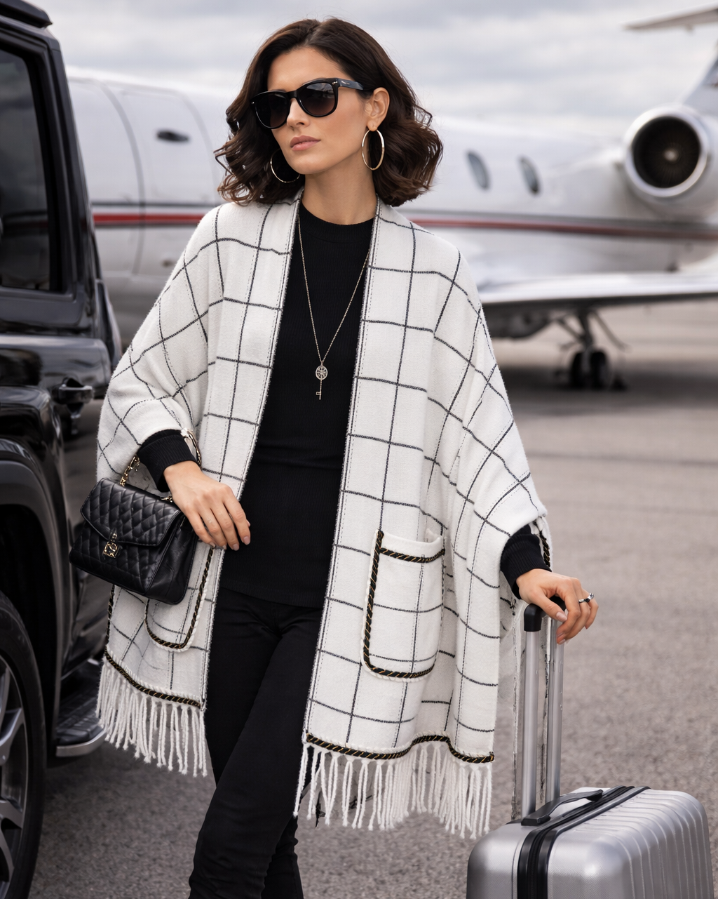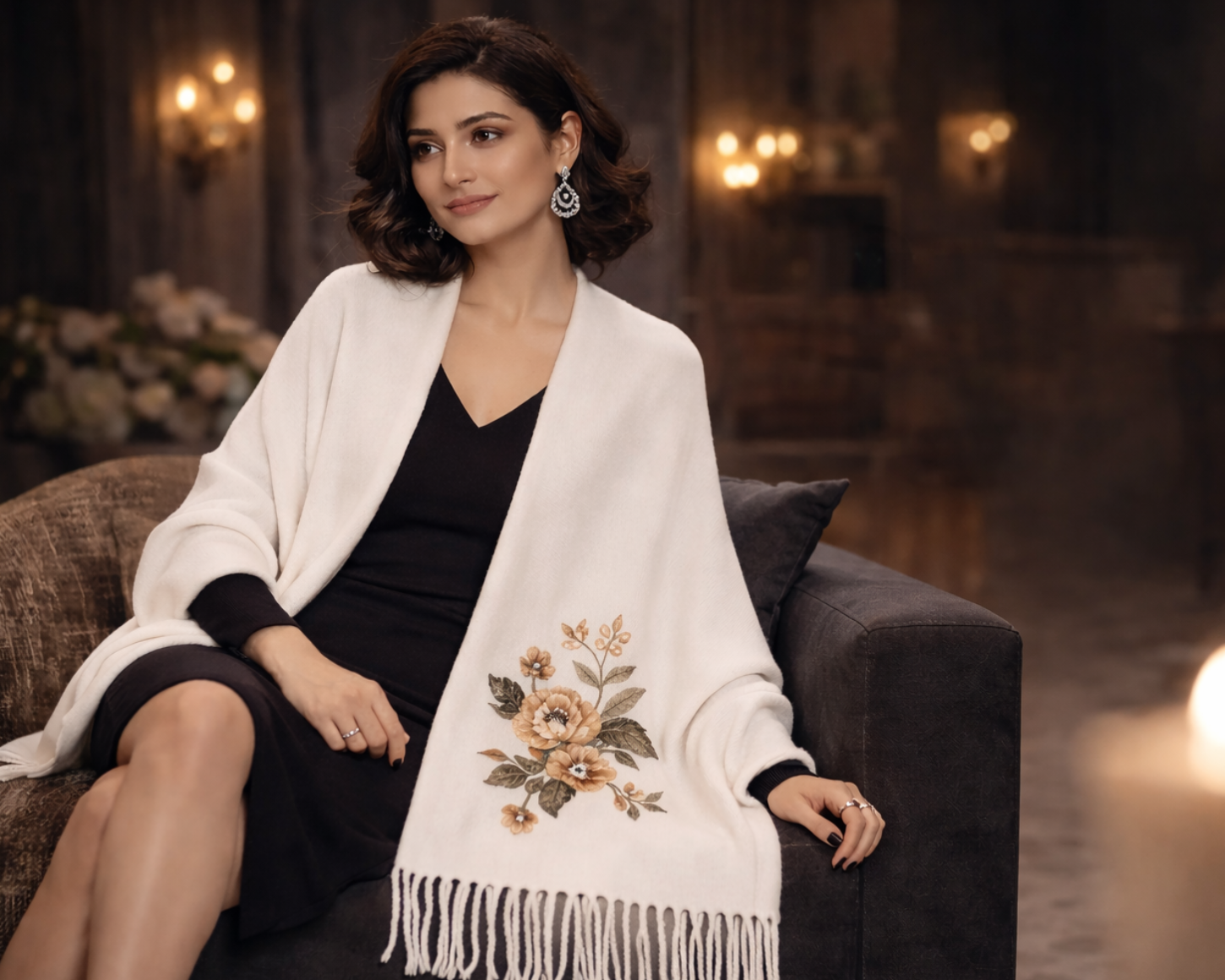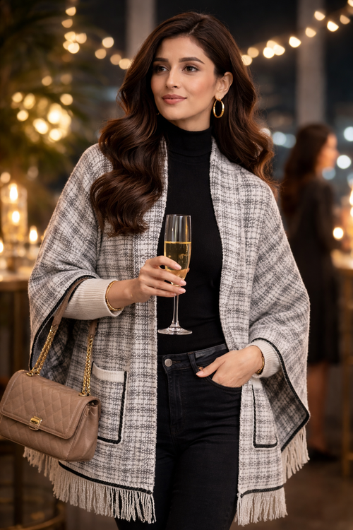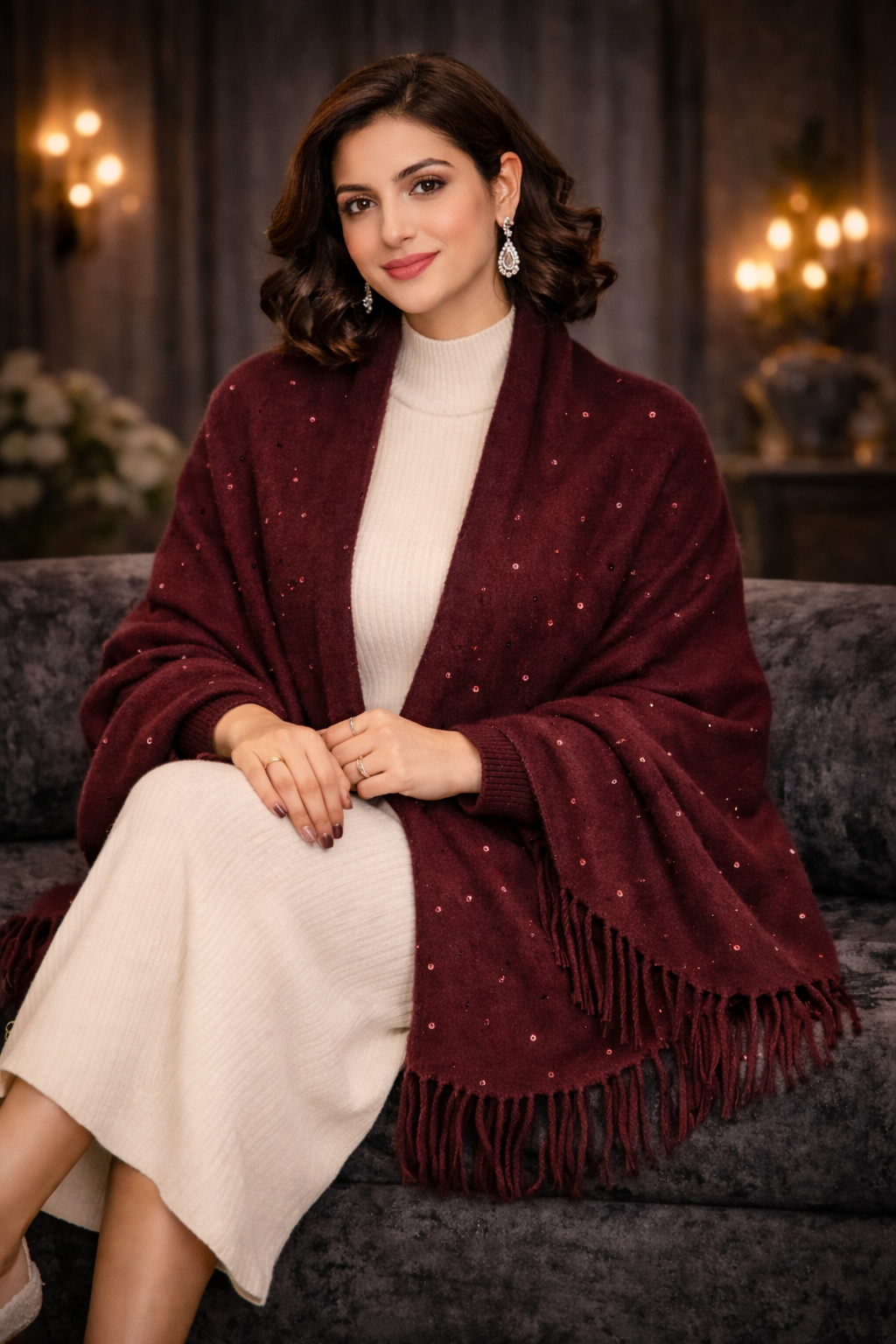 Integrated sleeves anchor the shawl to your body, keeping it perfectly in place while preserving a fluid, elegant drape.
